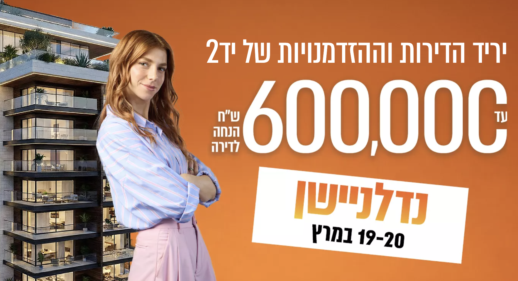 נדלניישן 4 – יריד הדירות וההזדמנויות של יד2 – חוזר ובגדול, והוא מביא איתו הצעה שקשה להתעלם ממנה: הנחות של עד 600,000 ש״ח ברכישת דירה למבקרי האירוע. אחרי ההצלחות הקודמות, היריד מתרחב ומציג השנה היצע רחב במיוחד – לא רק דירות קבלן חדשות, אלא גם עשרות אלפי דירות יד שנייה מכל רחבי הארץ. כל הדירות הכי שוות – בכתובת אחת.